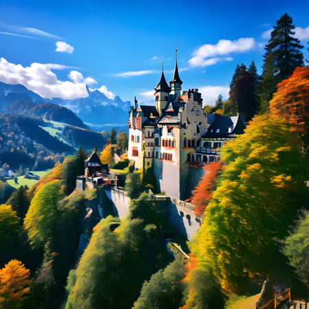 An AI generated illustration of a majestic castle atop a mountain surrounded by lush foliage and towering peaks, creating an awe-inspiring sight