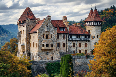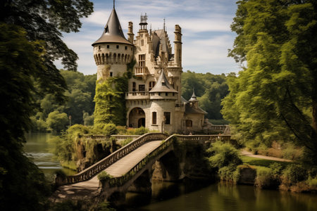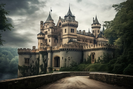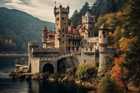 medieval castle perched on a hill, surrounded by a dense forest, with a winding river below. Generative AI