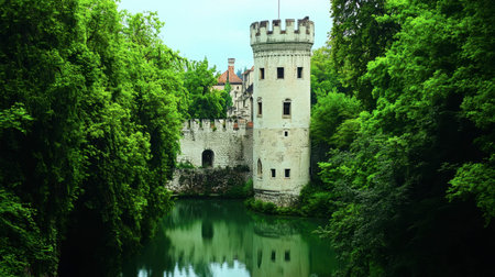 This stunning image showcases a medieval castle nestled among dense greenery, with tranquil water reflecting its majestic tower, creating a serene, picturesque landscape.
