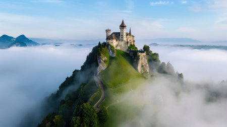 Aerial view of an enchanting castle surrounded by mist and fog. The scene captures nature's beauty at dawn, evoking a magical and serene atmosphere.