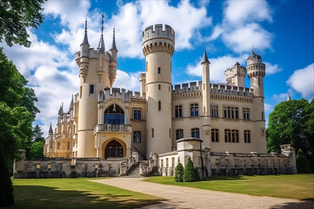 Generative AI : Famous Czech castle Hluboka nad Vltavou medieval building with beautiful park travel outdoor european background