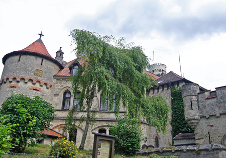 Vaduz, Liechtenstein - July 01, 2016: Landscape view on the roofs of Vaduz castle in the capital of Liechtenstein. This castle is the palace and official residence of the Prince of Liechtenstein