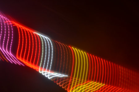 Blue, red, white and purple light painting photography, long exposure, ripples and waves against a black background. Curves and waves of neon green light against a black background.