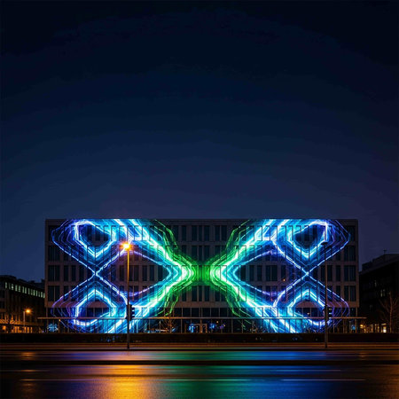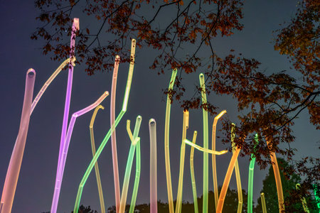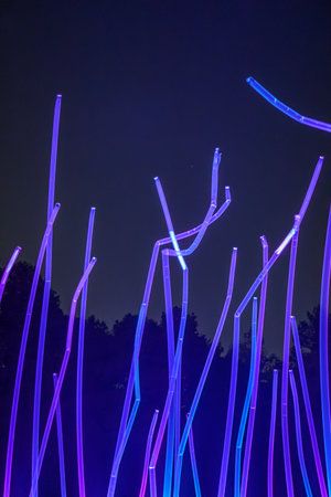Vibrant led light installation and metal arches at night during outdoor music festival entrance