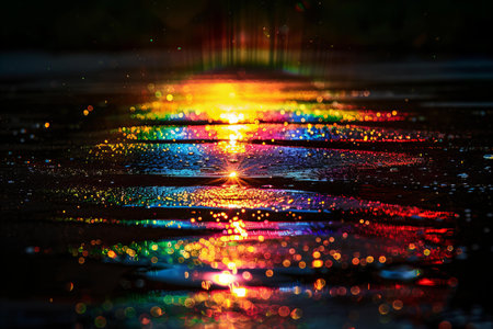 A captivating nighttime image featuring colorful reflections on a wet surface, showcasing vibrant lights and a dreamy atmosphere perfect for artistic projects.