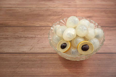 Litchi is placed in a wooden plate, peeled or unopened, on a dark wood grain table