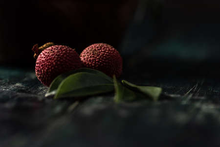 Wet Red Lychee fruit With Leaves Blurry Background Image