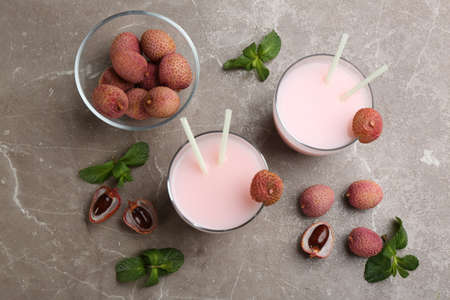 Fresh organic lychee fruit in a bowl on a rustic grey background. Copy space.