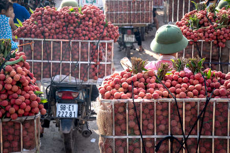 Luc Ngan District, Bac Giang Province, Vietnam - July 10, 2020: Farmers harvest litchi fruits and transport them by motorbike for sale at the market