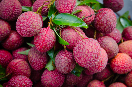 Litchi chinensis. Ripe, red litchi fruits for sale