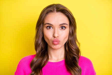 Photo of pretty flirty curly young lady dressed pink pullover sending kiss lips pouted isolated yellow color background