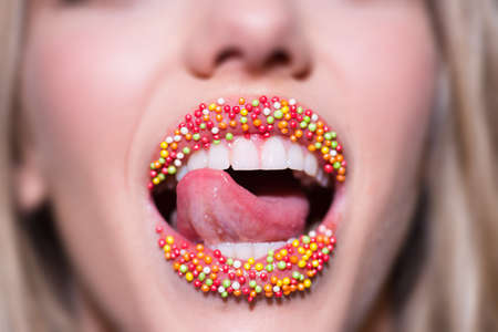 Sweet Lips. Female mouth decorated with candy. Compliments and sweet words. Beautiful mouth of young girl with creative lipstick. Makeup for a Christmas party. Seductive tongue and white teeth smile.