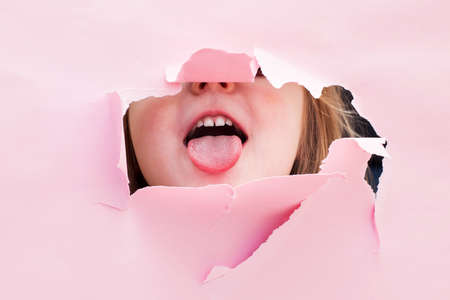 portrait of a funny kid girl showing tongue in a torn paper hole on a pink background