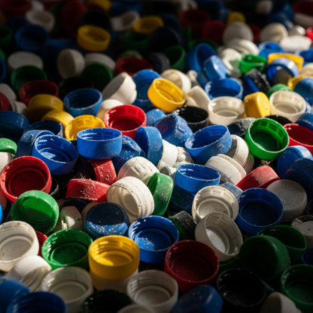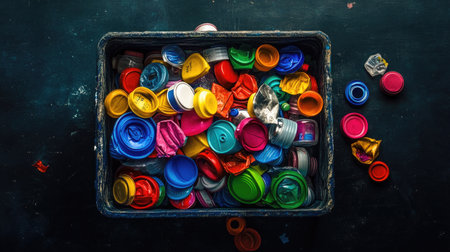 Bright plastic bottle caps piled in a dark bin, showing contrast between waste and recycling potential
