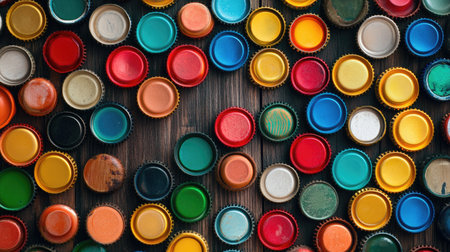 Abstract close-up of colorful beer bottle caps arranged in a circular pattern on a wooden surface