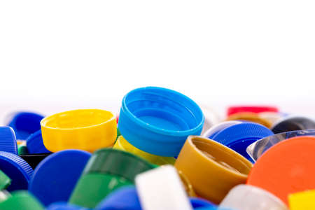 Colorful plastic bottle caps. Studio shot. Plastic waste. Isolated on a white background.