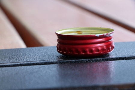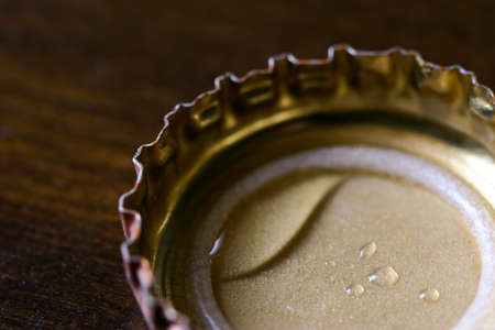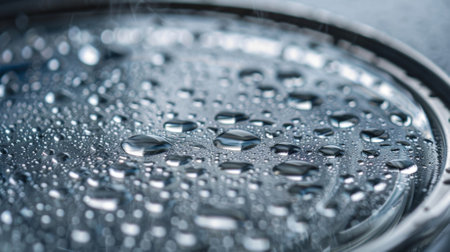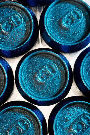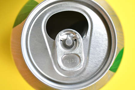 The lid of the aluminum can from the carbonated drink is covered with droplets of condensate.