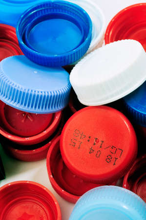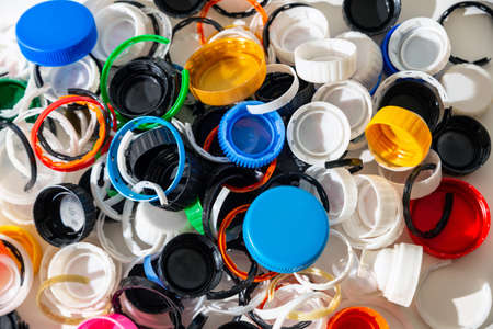 Colorful plastic bottle caps. Studio shot. Plastic waste.