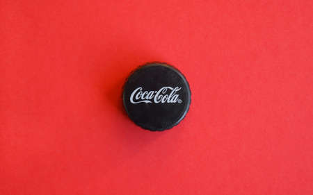 KHARKOV, UKRAINE - NOVEMBER 24, 2019: black cap with coca cola logo on red background