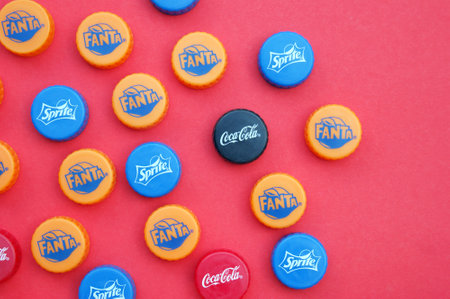 KHARKIV, UKRAINE - JUNE 14, 2020: plastic caps from different drinks soda. Popular brands: Coca Cola, Fanta, Sprite