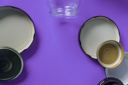 Recycling glass jar lids for reuse of single use items; Zero no waste recycle program campaigns; Recyclable concept on blank empty copyspace, text room space for copy on horizontal purple background.