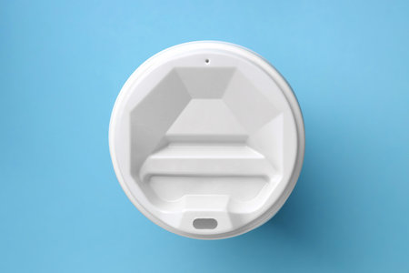 One paper cup with white lid on light blue background, top view. Coffee to go