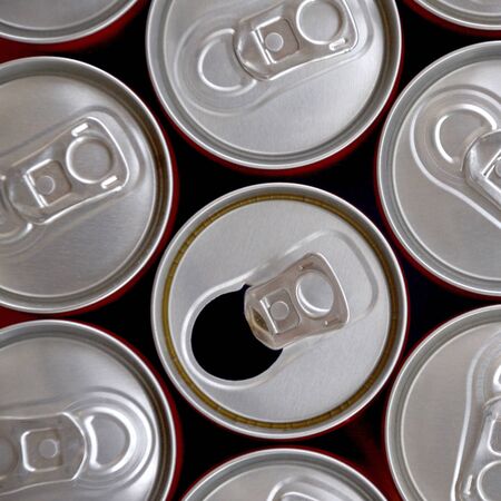 Many cans of soda soft drink, lemonade, cola, beer or energy drink containers. A lot of recycled cans made from aluminum and being prepared for re-production.