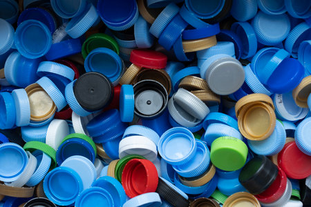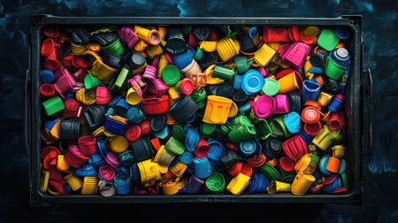 Dark container filled to the brim with recyclable plastic caps, emphasizing reuse potential