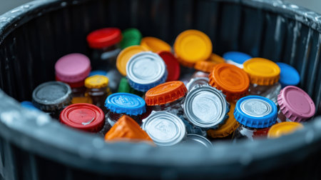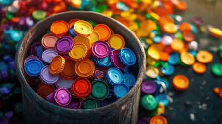 A vibrant collection of colorful plastic bottle caps arranged in a container, highlighting the importance of recycling and environmental responsibility.