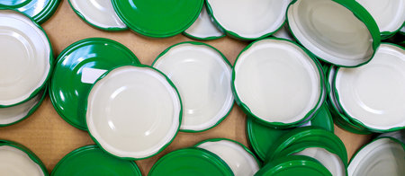 Recycling glass jar lids for reuse of single use items; Zero no waste recycle program campaigns; Recyclable concept on blank empty copyspace, text room space for copy on horizontal cyan background.