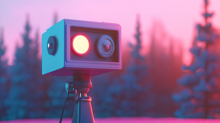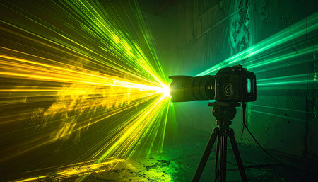 Digital camera on tripod with laser beam in dark room. 3D rendering