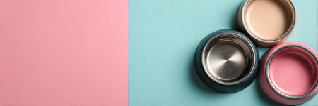 Colorful pet bowls are placed on a vibrant pastel background, leaving plenty of room above for adding text or designs. A perfect setup for pet lovers.