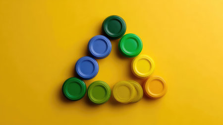An engaging composition of bottle caps arranged in a triangle on a bright yellow background, showcasing vibrant colors and playful patterns, perfect for creative projects.