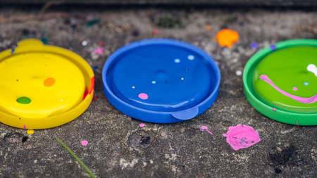 jars with gouache of different colors on Colored background. hobby painting. Top view with empty space. workplace for creativity. home teaching concept drawing.