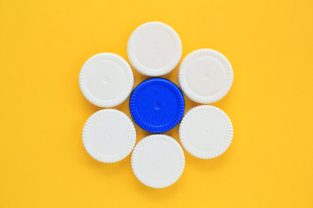 Plastic bottle caps for drinking water on a colored background. Recycling, waste separation, environmental care. Ecologycal banner.