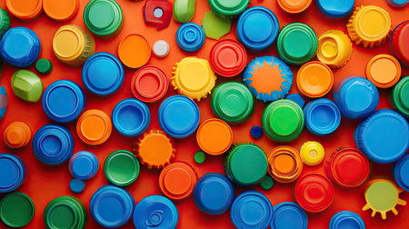 A dense arrangement of colorful plastic bottle caps viewed from directly above. Clear details and vibrant colo...