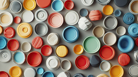 Eco-conscious layout of plastic bottle caps and tin cans on a bright background, representing a commitment to recycling efforts.