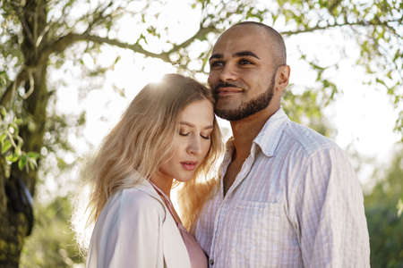 Young romantic couple close up in backlight