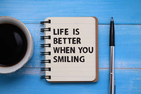 Life is better when you smiling, text words typography written on wooden block against blue background, life and business motivational inspirational concept