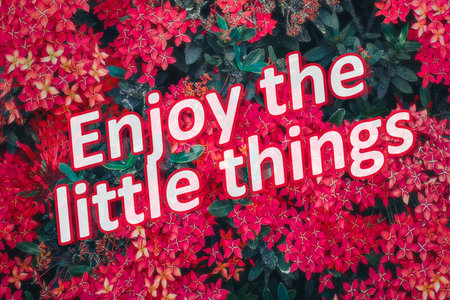 Enjoy little things text over closeup shot colorful botanic motif red flowers and green dark plants background