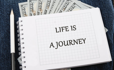 A spiral notebook shows the phrase Life is a journey written in bold letters.