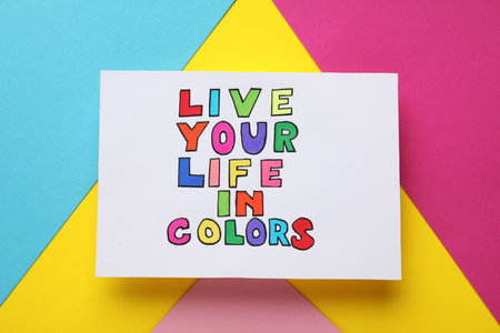 Words Live Your Life In Colors on bright colorful background, top view