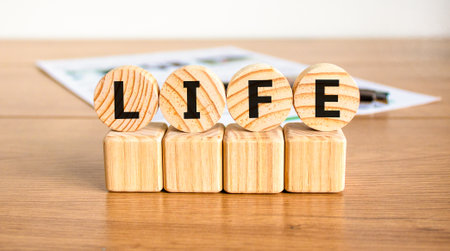 Life symbol. Concept word Life on beautiful wooden blocks. Beautiful wooden table white background. Business, lifestyle, support and life concept. Copy space.