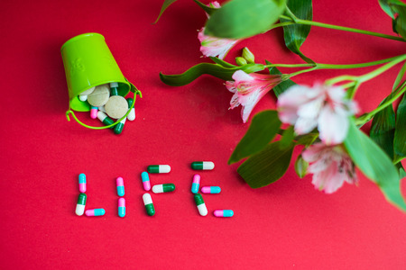 Top view Caption life with the tablets at a red background with a tiny bucket