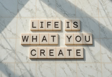 A visually appealing arrangement of the words Life is what you create on a marble tile background, perfect for inspiring motivation and personal growth in various creative projects.
