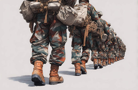 Oviedo, Spain - May, 25, 2024: A lines of paratroopers in camouflage uniforms march in formation, carrying parachutes and equipment. They are preparing for a military mission, showcasing their discipline and readiness