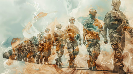 Troops in camouflage uniforms conduct a synchronized march under a colorful sunset sky, showcasing discipline.