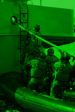 Soldiers marines ( sea commandos ) boarding a ship in a simulated assault. A Navy Soldiers boarding team member assigned to the ship for the to conduct a search of the vessel.