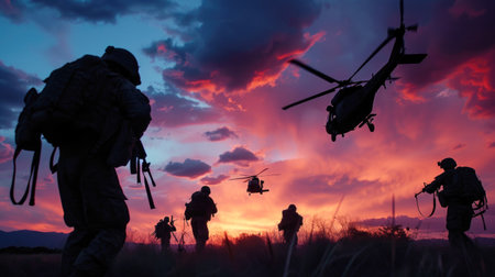 Silhouette of infantry soldier, marine corps fighter, navy special operations team member in full tactical ammunition running with weapon in hands during airborne operation with helicopters support