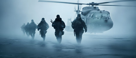 Soldiers in arctic conditions move towards a helicopter in a blizzard. A military operation underway.